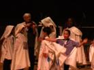 Le travail de la voix : dans deux directions complémentaires : le théâtre et le chant travail de la respiration, jeux de hauteurs et intensité, relation geste-voix, puis textes et enfin chants. Ne jamais dissocier le placement du corps dans l'espace et sa gestuelle de la réalisation vocale.